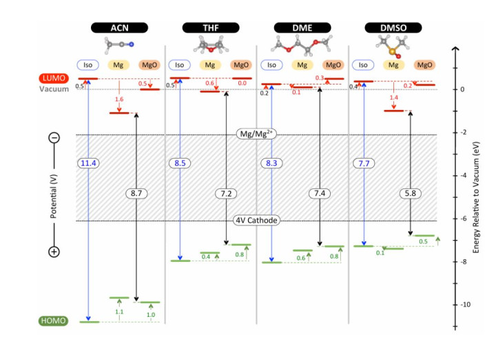 电解液分子的氧化稳定性通常由其HOMO能级决定,当HOMO能级过高时,分子容易失去电子而在高电位下被氧化分解;而其LUMO能级位置则与还原稳定性密切相关,当LUMO能级过低时,电解液分子在低电位下极易接受电子发生还原分解。